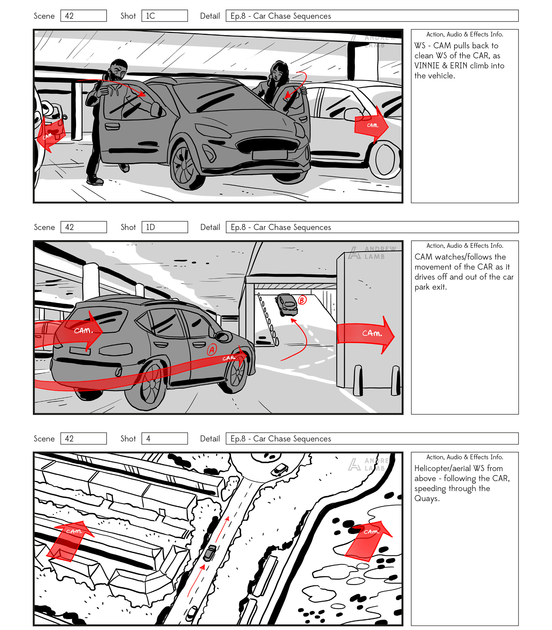 I boarded three lengthy action sequences for director Ruth Carney and director of photography Alex Veitch in 2022. The sample included below is from the series finale where the lead characters Vinnie O'Neil (Joseph Gilgun) and Erin Croft (Michelle Keegan), attempt a high speed getaway that culminates in a crash.